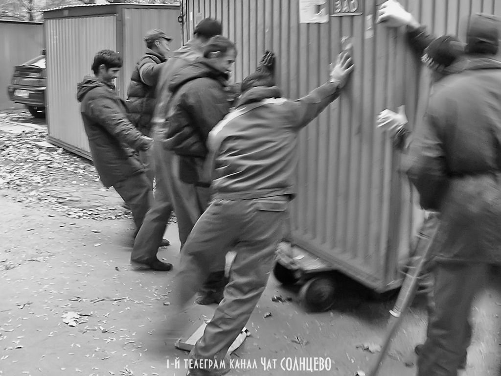 Переезд ракушки. Авиаторов. 2006 год Бригада дворников Жилищника, тогда вроде престиж, на своих тележках перетаскивает тент на новое место