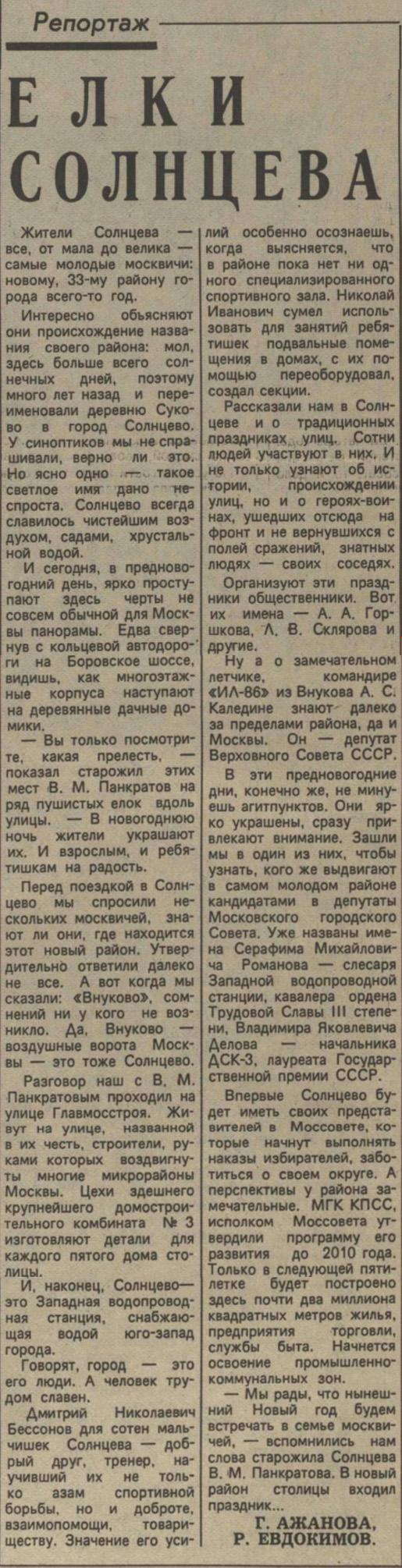 Статья о Солнцево из газеты Вечерняя Москва, 31 декабря 1984 года.