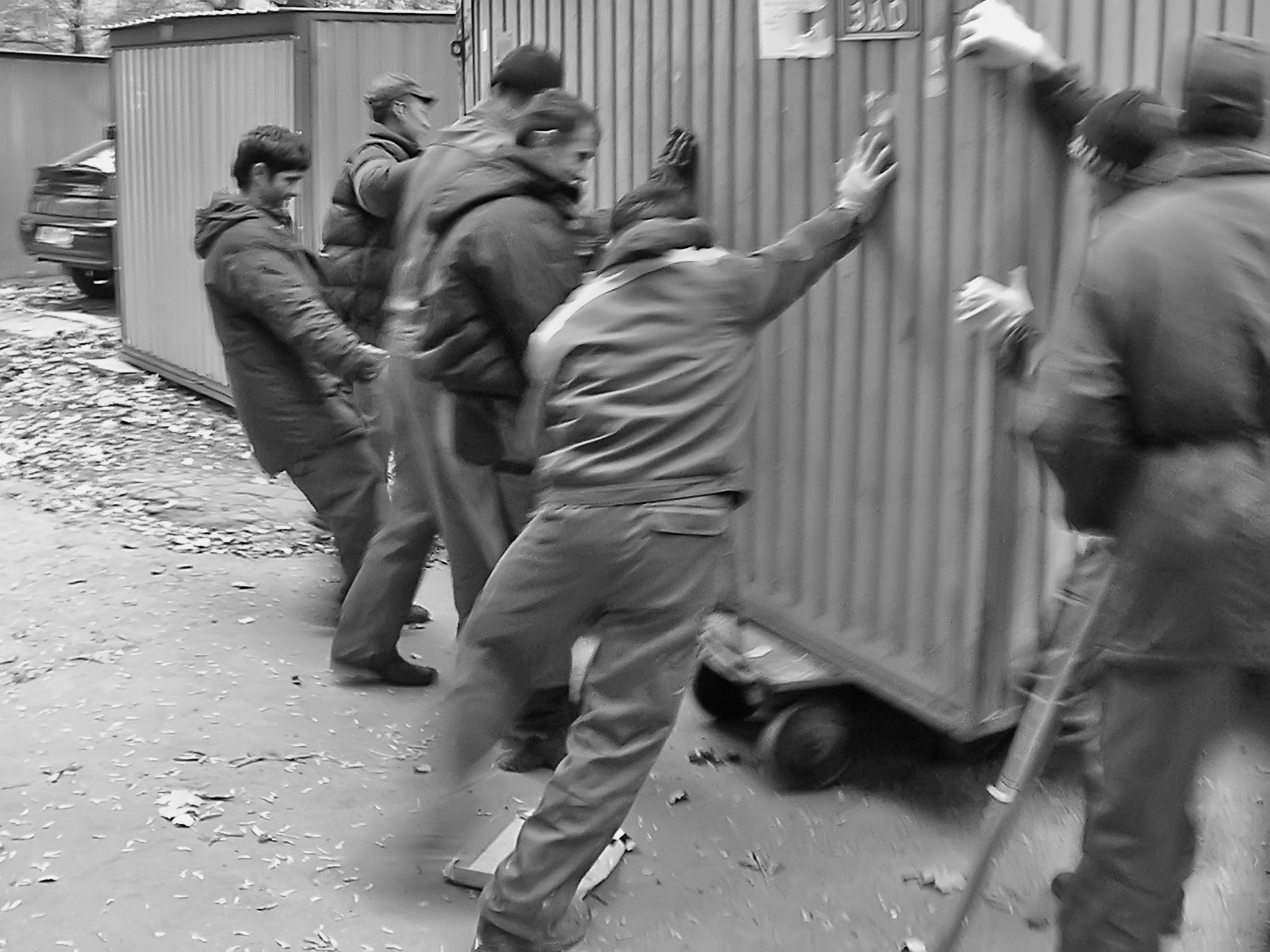 Дворники перемещают на тележках мешающие работам ракушки гаражи